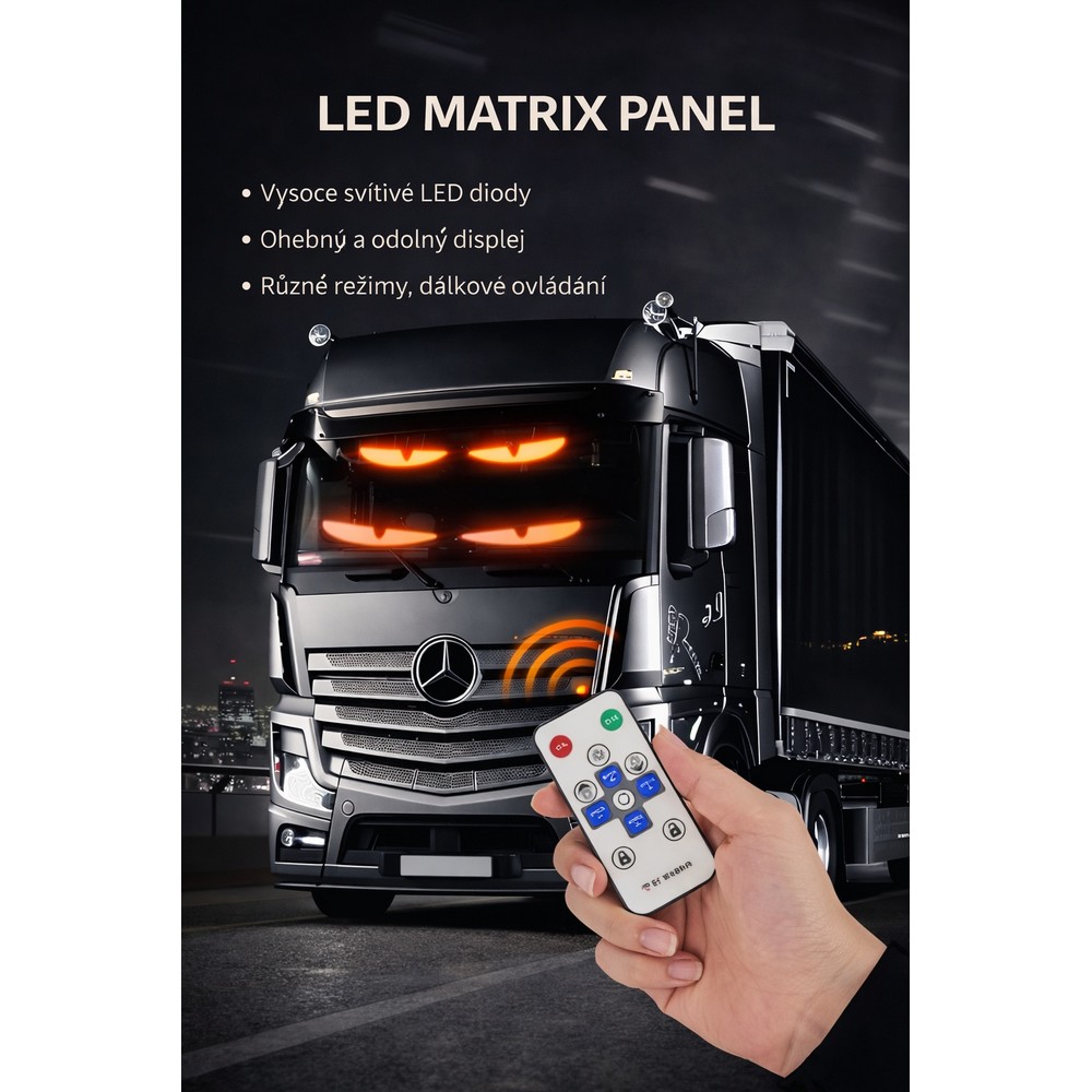 - Programovatelný LED displej „Devil Eyes“ s ovládáním přes aplikaci nebo dálkový ovladač – pro osobní i nákladní vozidla.