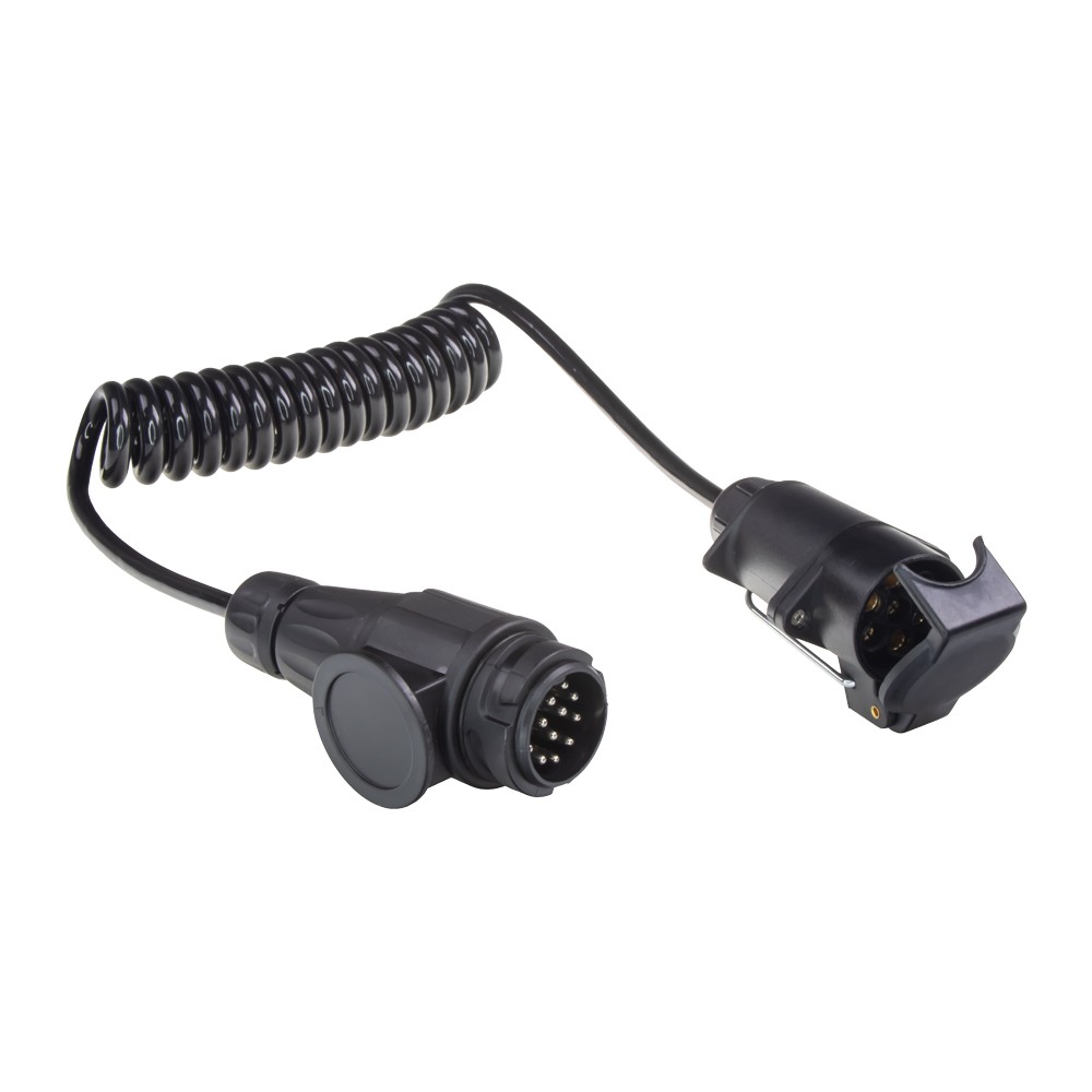 • Praktický spirálový propojovací kabel určený pro přímé elektrické propojení tažného vozidla s 13kolíkovou zásuvkou a přívěsu se 7kolíkovou kabeláží.
